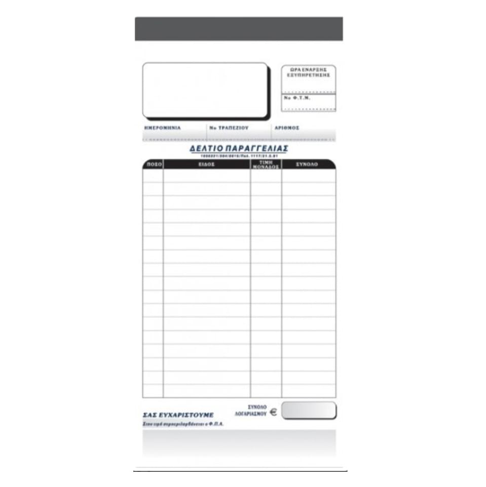 Δελτίο Παραγγελίας Εστιατορίου 251α Έντυπο παραγγελίας για εστιατόρια Κωδικός : 251α Διάσταση : 7,5 X 17 Πολλαπλότητα : 50 x 3 Αντίγραφα : 2 Χαρτί : Γραφής