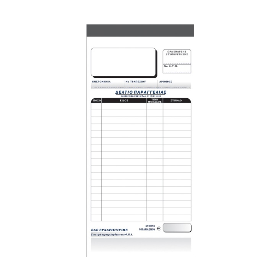 Δελτίο Παραγγελίας Εστιατορίου 251α Έντυπο παραγγελίας για εστιατόρια Κωδικός : 251α Διάσταση : 7,5 X 17 Πολλαπλότητα : 50 x 3 Αντίγραφα : 2 Χαρτί : Γραφής