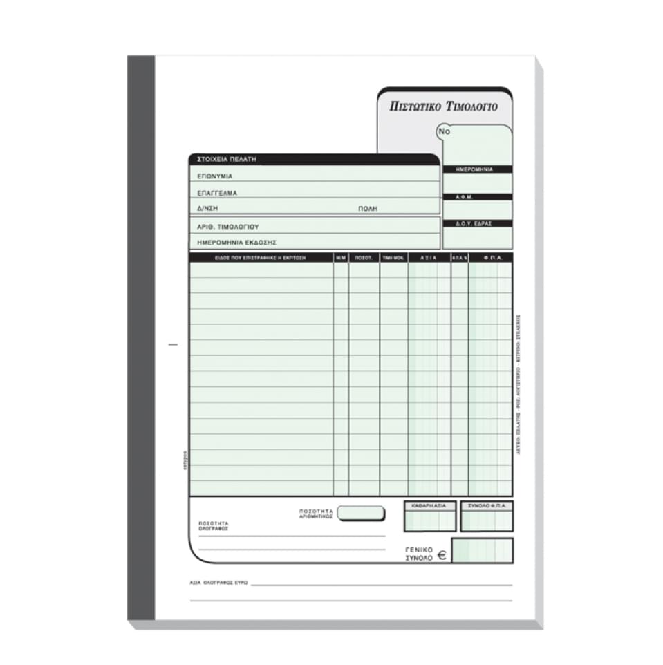 Διάσταση : 17 X 25 Πολλαπλότητα : 50 X 3 Αντίγραφα : 3 (Λευκό – Κίτρινο – Πράσινο) Χαρτί : Αυτογραφικό Στήλες ΦΠΑ : 1