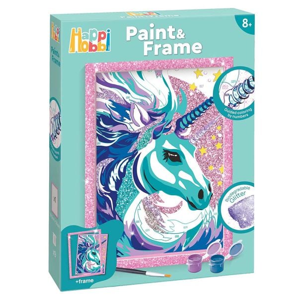 Το HappiHobbi Paint & Frame Paint by Numbers Fairytale Unicorn, περιλαμβάνει μία προτυπωμένη καρτολίνα που κάθε σημείο της έχει έναν αριθμό ο οποίος ανταποκρίνεται σε ένα χρώμα. Το παιδί βλέπει ποιο χρώμα αντιστοιχεί στην κάθε περιοχή και την ζωγραφίζει αντίστοιχα. Το αποτέλεσμα είναι άκρως ικανοποιητικό καθώς ο χρωματισμός της καρτολίνας είναι καθοδηγούμενος.