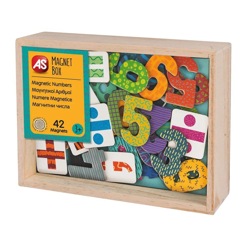 Ένα σετ 42 ξύλινων μαγνητών, αριθμών και αριθμητικών συμβόλων. Τα παιδιά ξεκινούν με την απλή οπτική επαφή με τους αριθμούς μέσω του παιχνιδιού με τους ξύλινους μαγνήτες, στη συνέχεια αρχίζουν να κατανοούν την έννοιά τους και να τους αναγνωρίζουν και τέλος εξασκούνται σε αριθμητικές πράξεις. Τα παιδιά συνδυάζοντας τους παρεχόμενους μαγνήτες μπορούν να δημιουργήσουν και μεγαλύτερους αριθμούς από το 9, επεκτείνοντας τη γνώση τους.